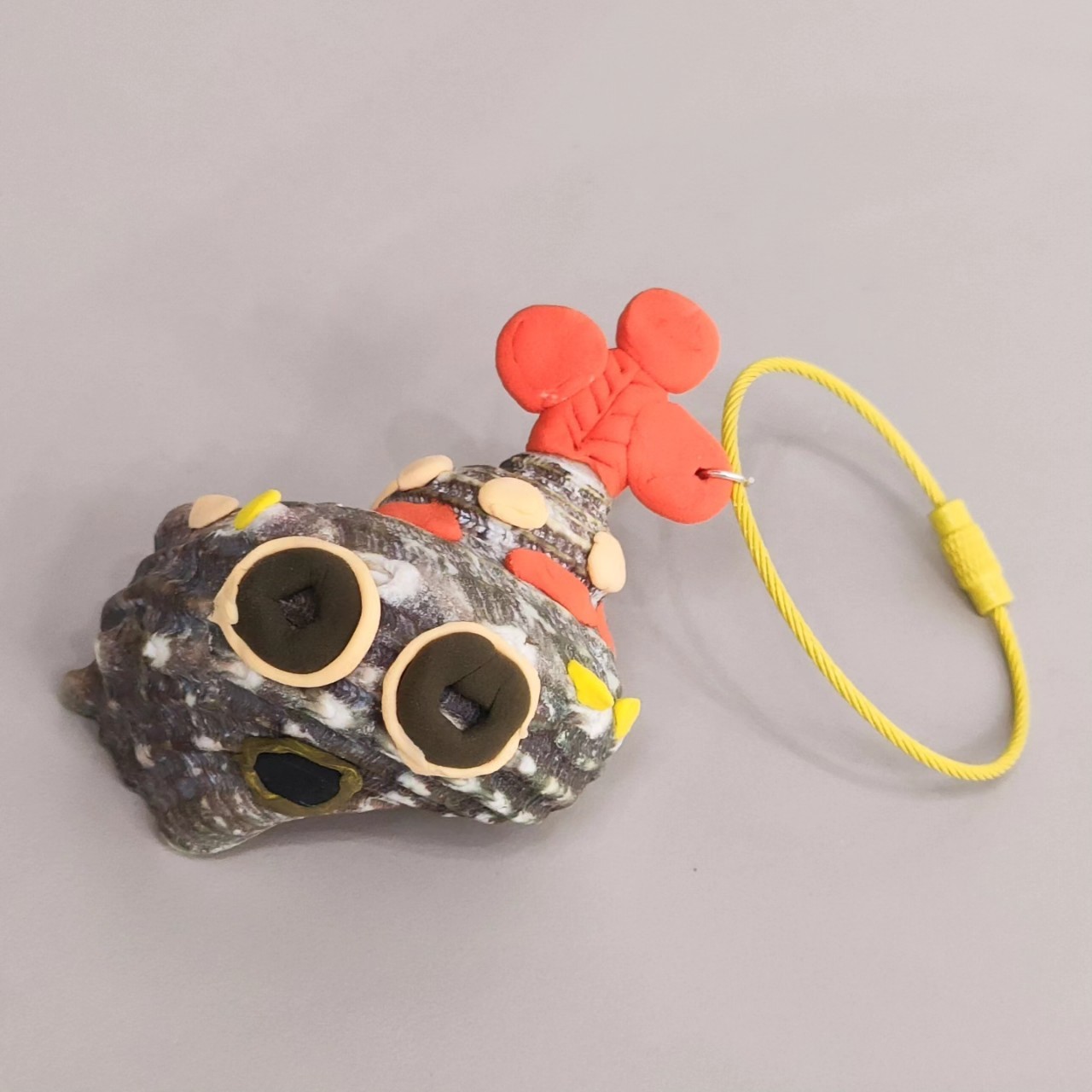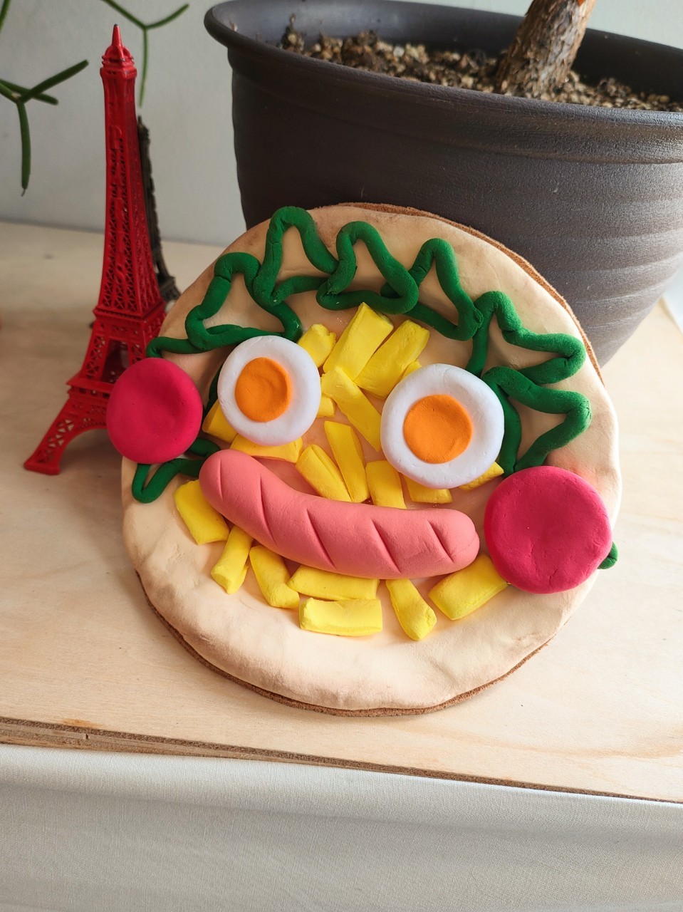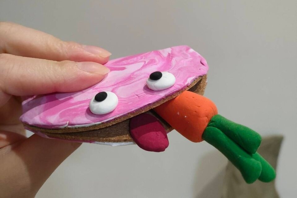 コルクシートを円形に切って半分に折り、薄く伸ばした粘土を貼り目をつけた、口がパクパク動く作品です。